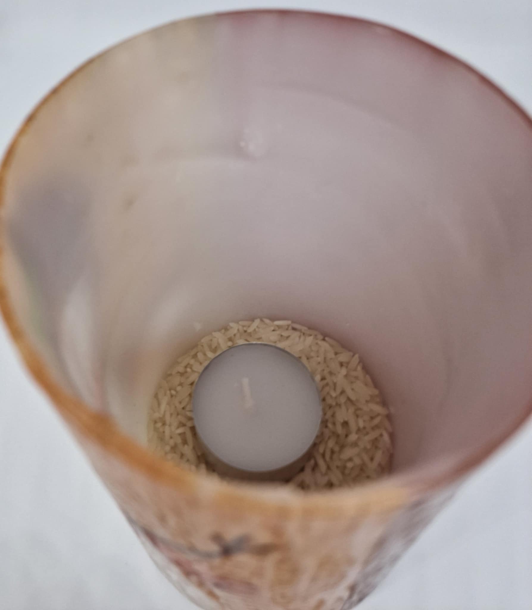 Giet de rijst, die je in het zakje vindt, in de kaarslantaarn, zodat deze de onderkant van de lantaarn bedekt. Plaats vervolgens het waxinelicthje op de rijst en zorg ervoor dat het waxinelichtje zich in het midden van de voet bevindt en niet te dicht bij de wanden van de kandelaar, zodat de wanden niet beschadigd raken door de hitte van de vlam.Je kunt in plaats van rijst, zand, kiezelstenen of linzen. Je kunt van alles gebruiken waarvan je denkt dat het geschikt is om de basis van het kaarslantaarn te beschermen tegen de hitte van de warmte.