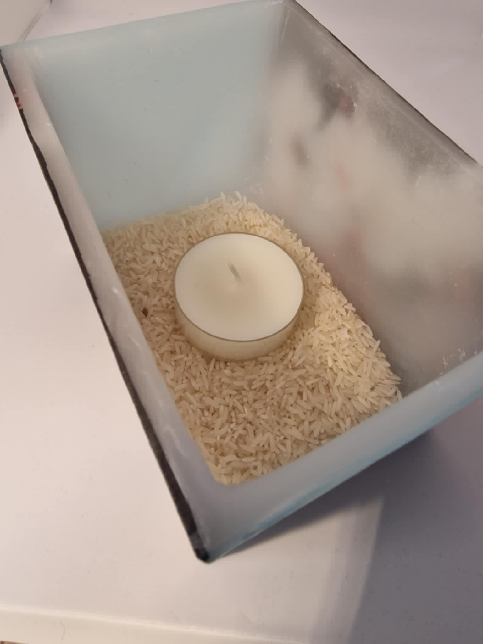 Giet de rijst, die je in het zakje vindt, in de kaarslantaarn, zodat deze de onderkant van de lantaarn bedekt. Plaats vervolgens het waxinelicthje op de rijst en zorg ervoor dat het waxinelichtje zich in het midden van de voet bevindt en niet te dicht bij de wanden van de kandelaar, zodat de wanden niet beschadigd raken door de hitte van de vlam.Je kunt in plaats van rijst, zand, kiezelstenen of linzen. Je kunt van alles gebruiken waarvan je denkt dat het geschikt is om de basis van het kaarslantaarn te beschermen tegen de hitte van de warmte.