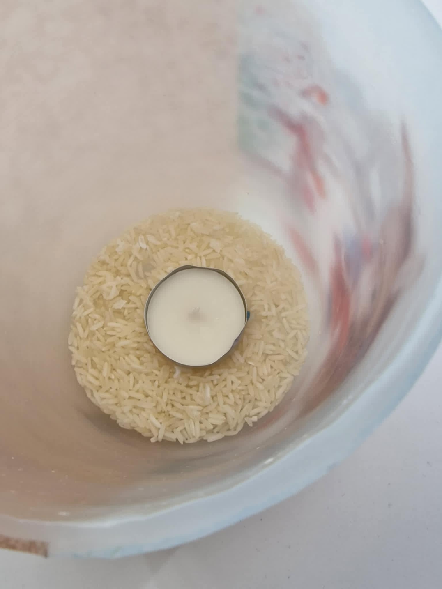 Giet de rijst, die je in het zakje vindt, in de kaarslantaarn, zodat deze de onderkant van de lantaarn bedekt. Plaats vervolgens het waxinelicthje op de rijst en zorg ervoor dat het waxinelichtje zich in het midden van de voet bevindt en niet te dicht bij de wanden van de kandelaar, zodat de wanden niet beschadigd raken door de hitte van de vlam.Je kunt in plaats van rijst, zand, kiezelstenen of linzen. Je kunt van alles gebruiken waarvan je denkt dat het geschikt is om de basis van het kaarslantaarn te beschermen tegen de hitte van de warmte.