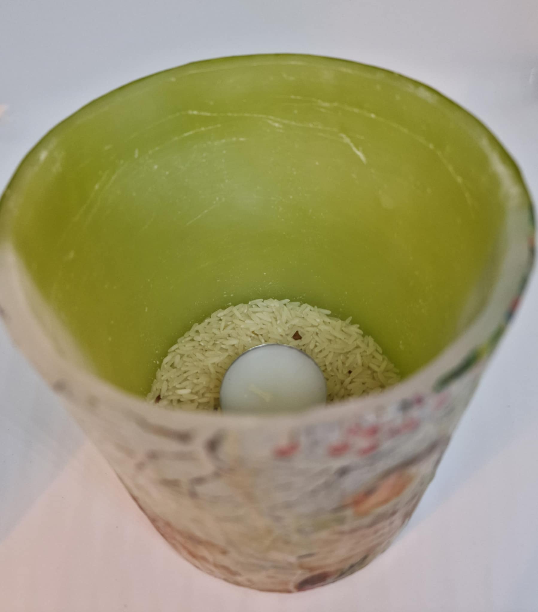 Giet de rijst, die je in het zakje vindt, in de kaarslantaarn, zodat deze de onderkant van de lantaarn bedekt. Plaats vervolgens het waxinelicthje op de rijst en zorg ervoor dat het waxinelichtje zich in het midden van de voet bevindt en niet te dicht bij de wanden van de kandelaar, zodat de wanden niet beschadigd raken door de hitte van de vlam.Je kunt in plaats van rijst, zand, kiezelstenen of linzen. Je kunt van alles gebruiken waarvan je denkt dat het geschikt is om de basis van het kaarslantaarn te beschermen tegen de hitte van de warmte.