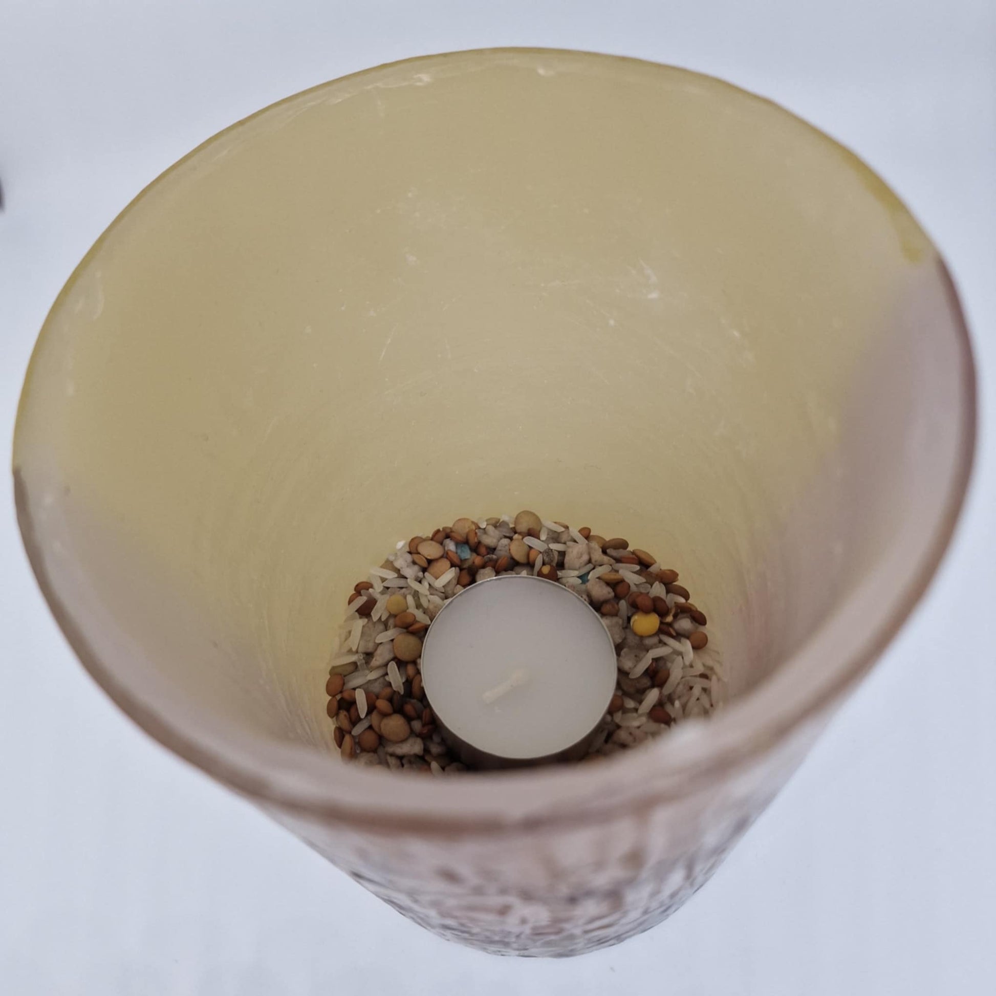 Giet de rijst, die je in het zakje vindt, in de kaarslantaarn, zodat deze de onderkant van de lantaarn bedekt. Plaats vervolgens het waxinelicthje op de rijst en zorg ervoor dat het waxinelichtje zich in het midden van de voet bevindt en niet te dicht bij de wanden van de kandelaar, zodat de wanden niet beschadigd raken door de hitte van de vlam.Je kunt in plaats van rijst, zand, kiezelstenen of linzen. Je kunt van alles gebruiken waarvan je denkt dat het geschikt is om de basis van het kaarslantaarn te beschermen tegen de hitte van de warmte.