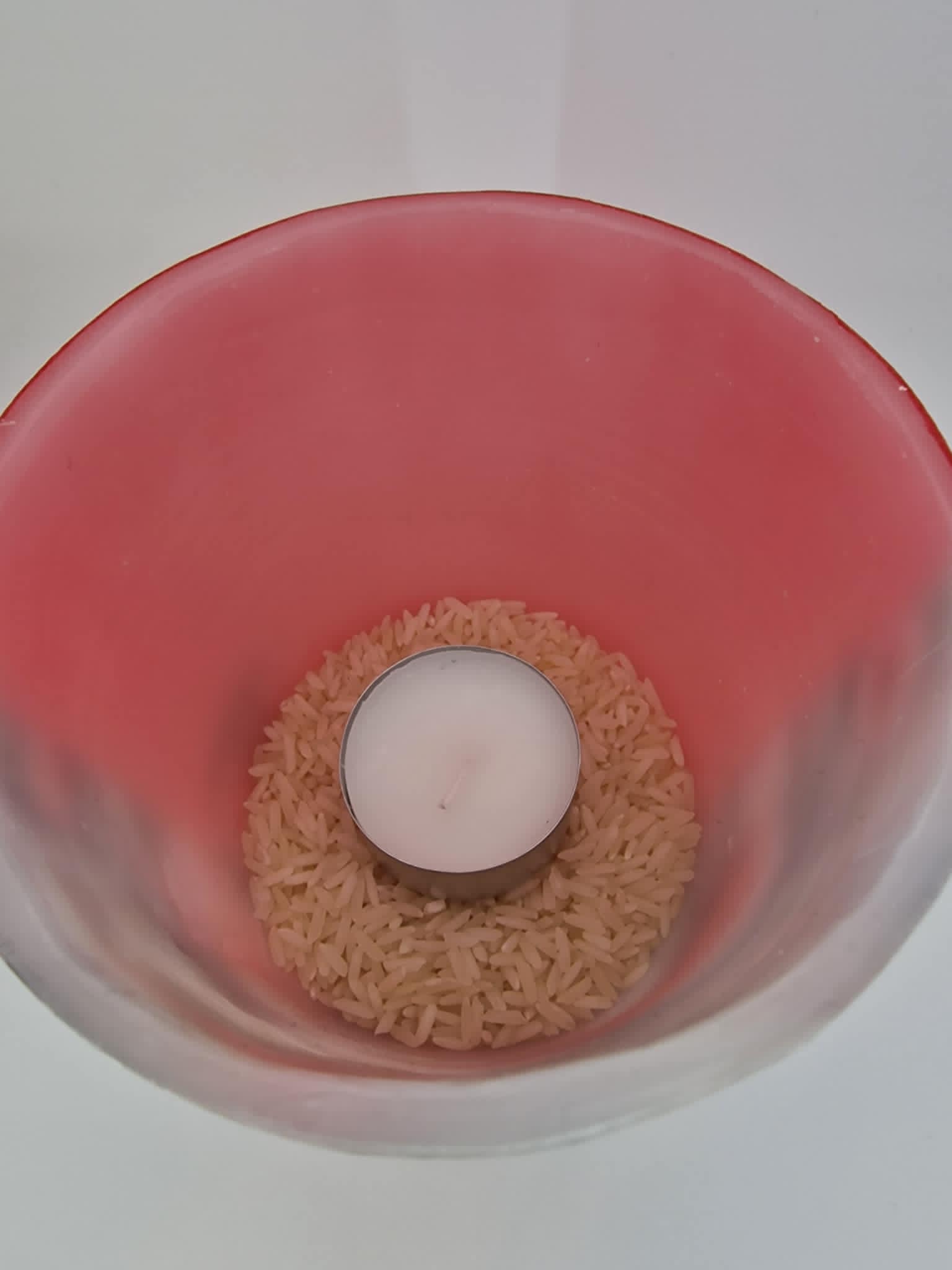Giet de rijst, die je in het zakje vindt, in de kaarslantaarn, zodat deze de onderkant van de lantaarn bedekt. Plaats vervolgens het waxinelicthje op de rijst en zorg ervoor dat het waxinelichtje zich in het midden van de voet bevindt en niet te dicht bij de wanden van de kandelaar, zodat de wanden niet beschadigd raken door de hitte van de vlam.Je kunt in plaats van rijst, zand, kiezelstenen of linzen. Je kunt van alles gebruiken waarvan je denkt dat het geschikt is om de basis van het kaarslantaarn te beschermen tegen de hitte van de warmte.