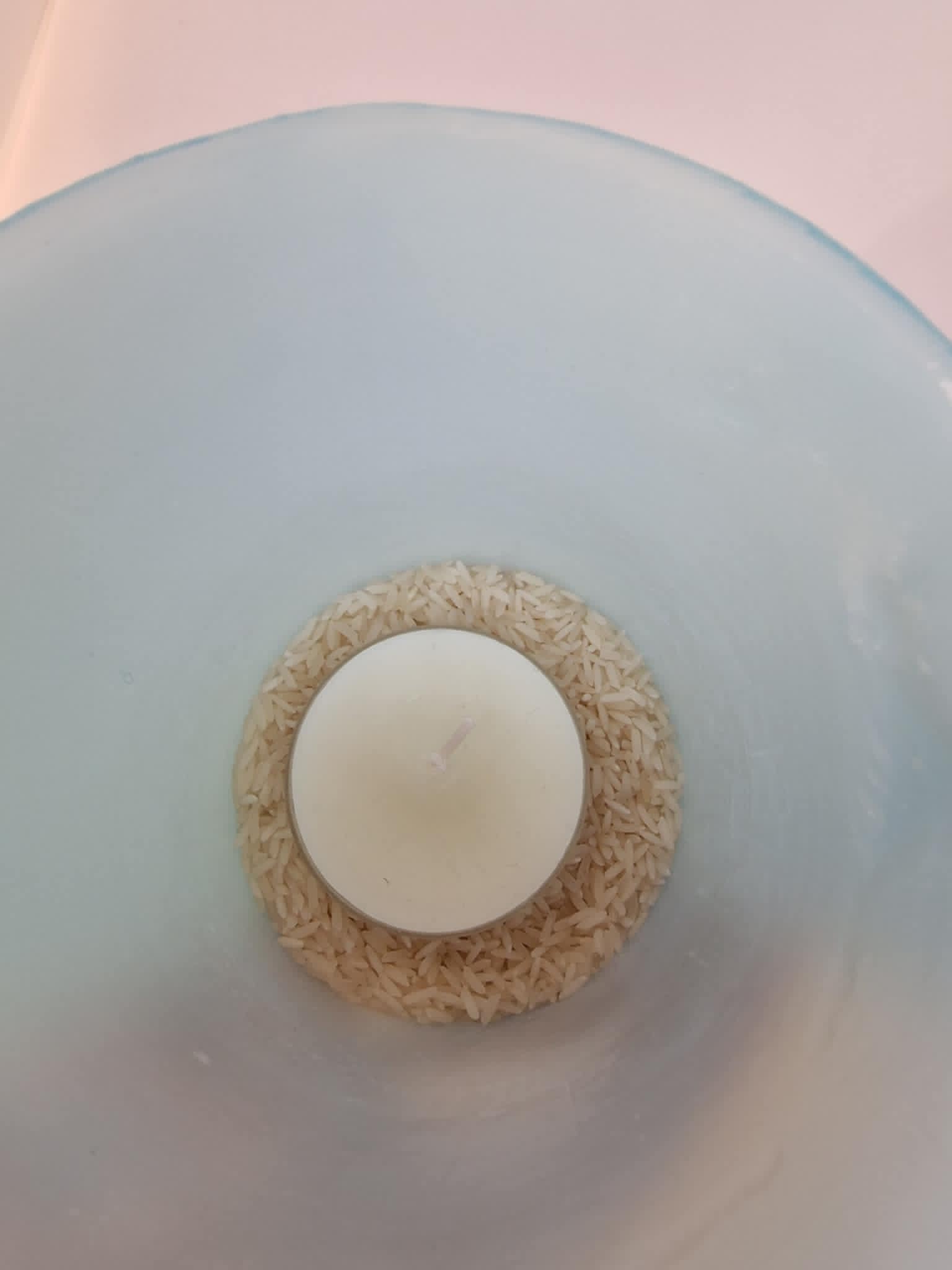 Giet de rijst, die je in het zakje vindt, in de kaarslantaarn, zodat deze de onderkant van de lantaarn bedekt. Plaats vervolgens het waxinelicthje op de rijst en zorg ervoor dat het waxinelichtje zich in het midden van de voet bevindt en niet te dicht bij de wanden van de kandelaar, zodat de wanden niet beschadigd raken door de hitte van de vlam.Je kunt in plaats van rijst, zand, kiezelstenen of linzen. Je kunt van alles gebruiken waarvan je denkt dat het geschikt is om de basis van het kaarslantaarn te beschermen tegen de hitte van de warmte.