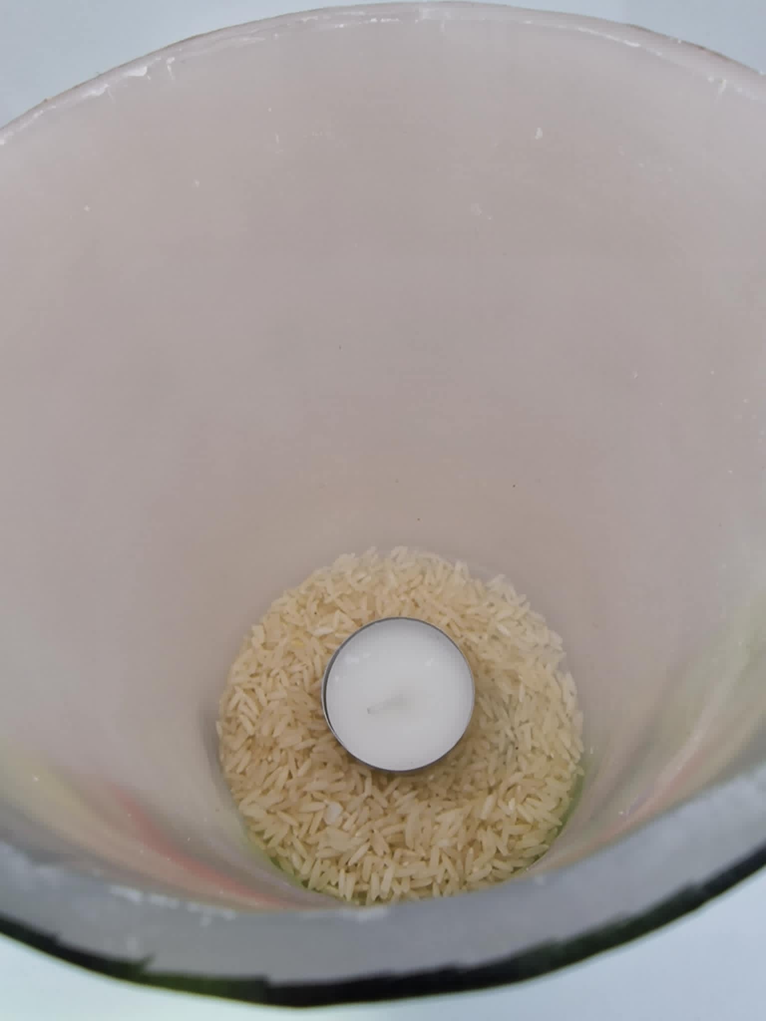 Giet de rijst, die je in het zakje vindt, in de kaarslantaarn, zodat deze de onderkant van de lantaarn bedekt. Plaats vervolgens het waxinelicthje op de rijst en zorg ervoor dat het waxinelichtje zich in het midden van de voet bevindt en niet te dicht bij de wanden van de kandelaar, zodat de wanden niet beschadigd raken door de hitte van de vlam.Je kunt in plaats van rijst, zand, kiezelstenen of linzen. Je kunt van alles gebruiken waarvan je denkt dat het geschikt is om de basis van het kaarslantaarn te beschermen tegen de hitte van de warmte.