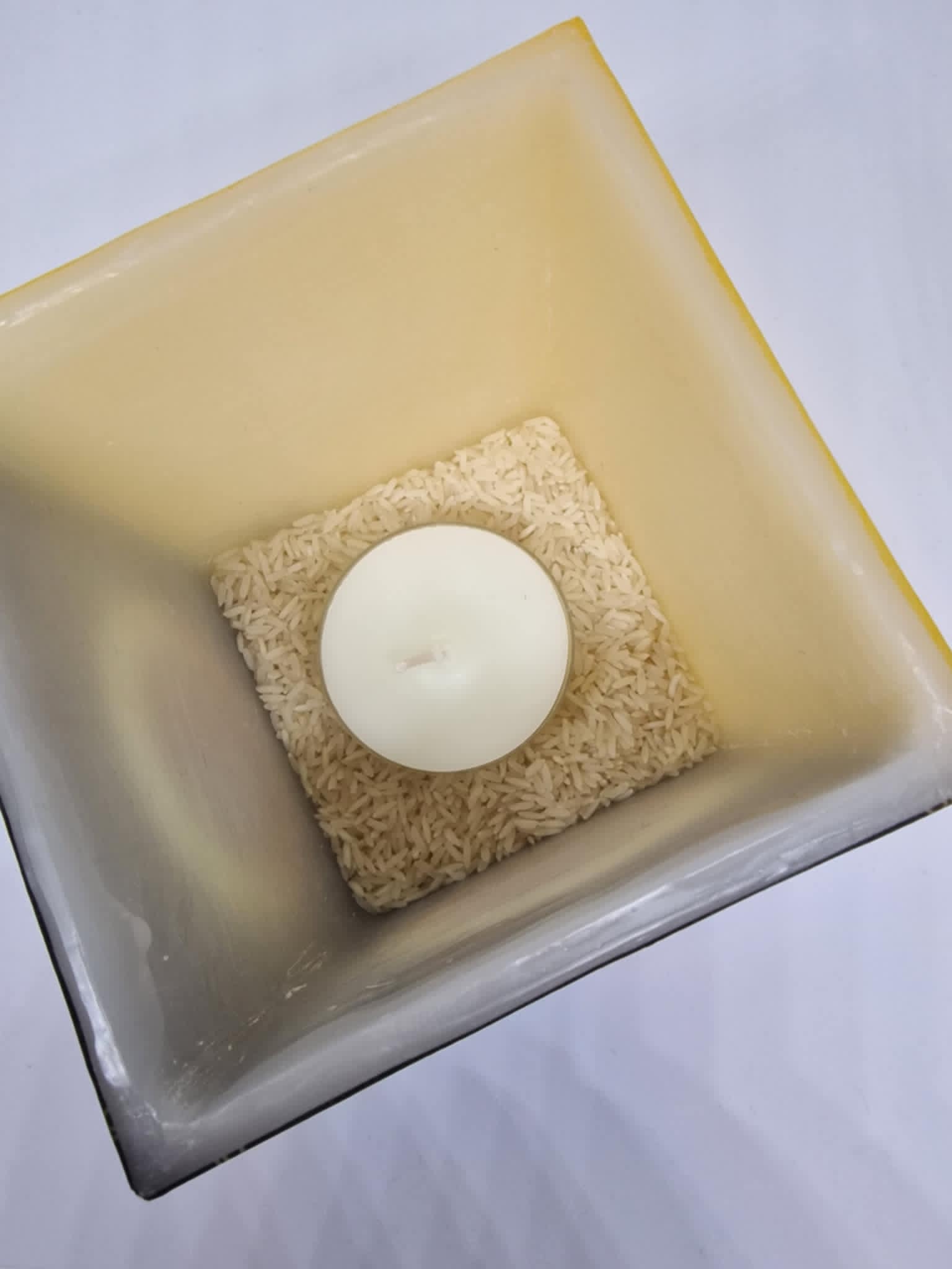 Je kunt in plaats van rijst, zand, kiezelstenen of linzen. Je kunt van alles gebruiken waarvan je denkt dat het geschikt is om de basis van het kaarslantaarn te beschermen tegen de hitte van de warmte