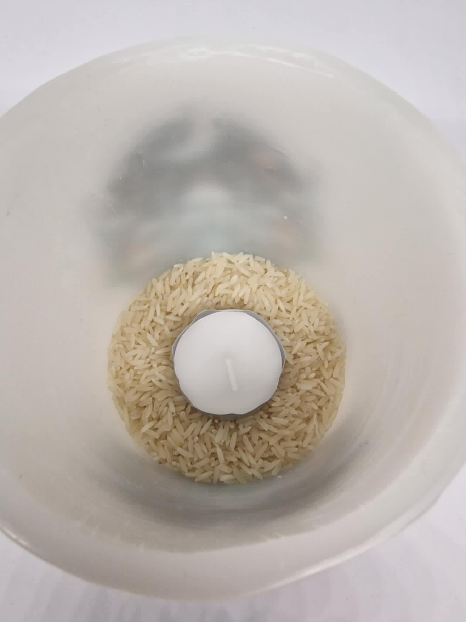 Je kunt in plaats van rijst, zand, kiezelstenen of linzen. Je kunt van alles gebruiken waarvan je denkt dat het geschikt is om de basis van het kaarslantaarn te beschermen tegen de hitte van de warmte
