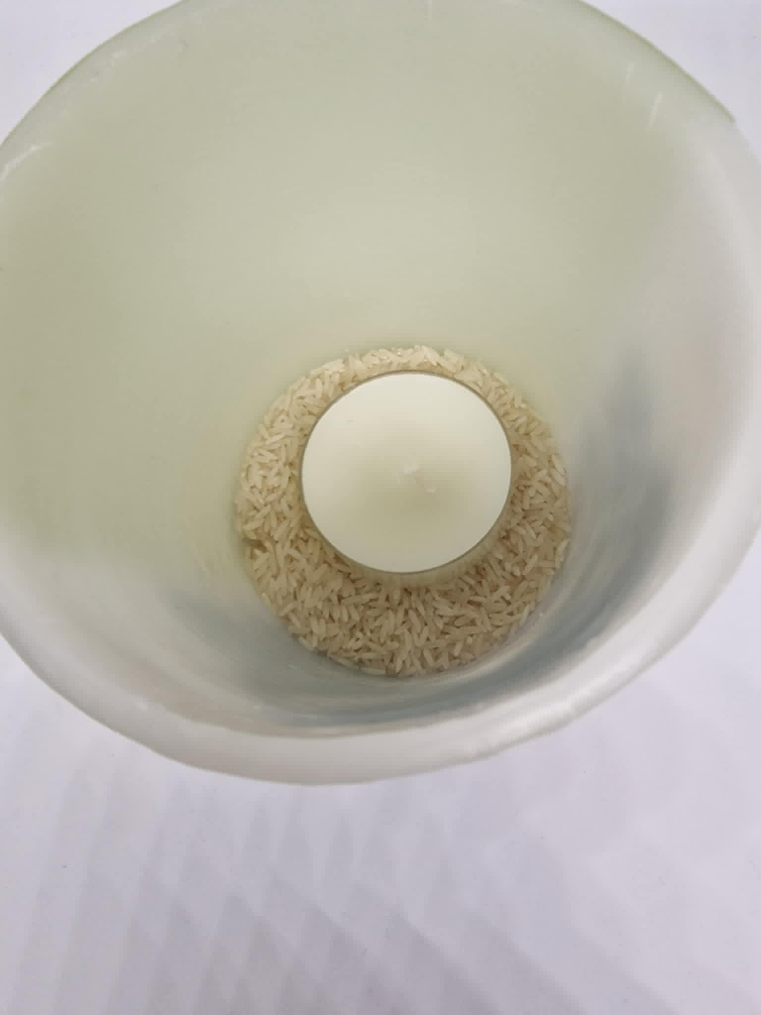 Je kunt in plaats van rijst, zand, kiezelstenen of linzen. Je kunt van alles gebruiken waarvan je denkt dat het geschikt is om de basis van het kaarslantaarn te beschermen tegen de hitte van de warmte