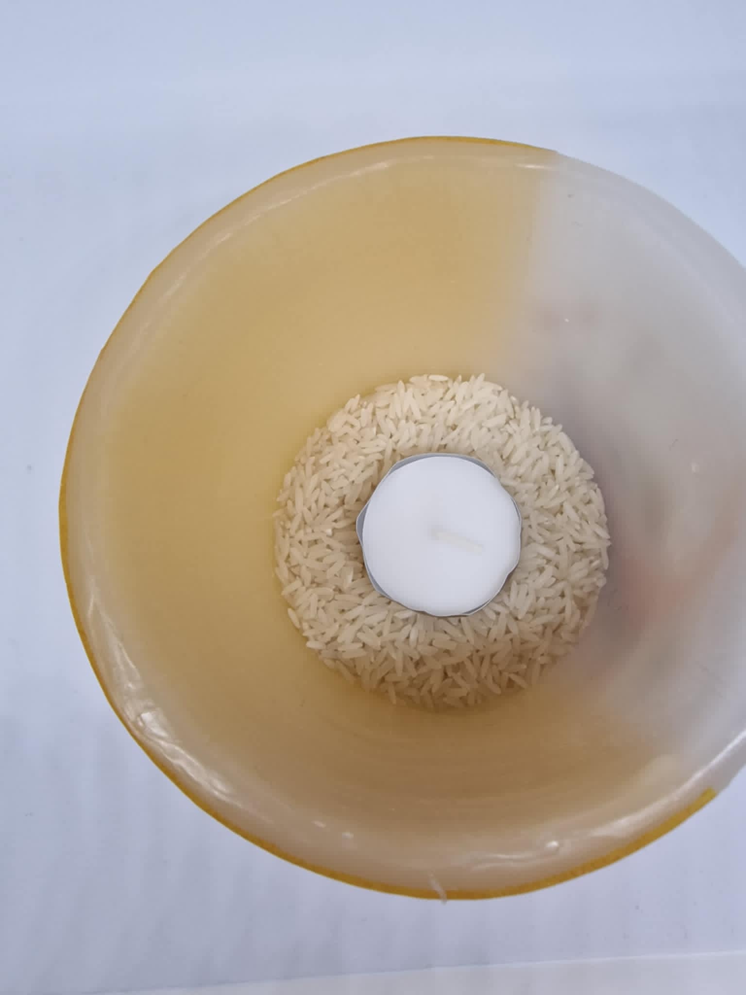 Je kunt in plaats van rijst, zand, kiezelstenen of linzen. Je kunt van alles gebruiken waarvan je denkt dat het geschikt is om de basis van het kaarslantaarn te beschermen tegen de hitte van de warmte