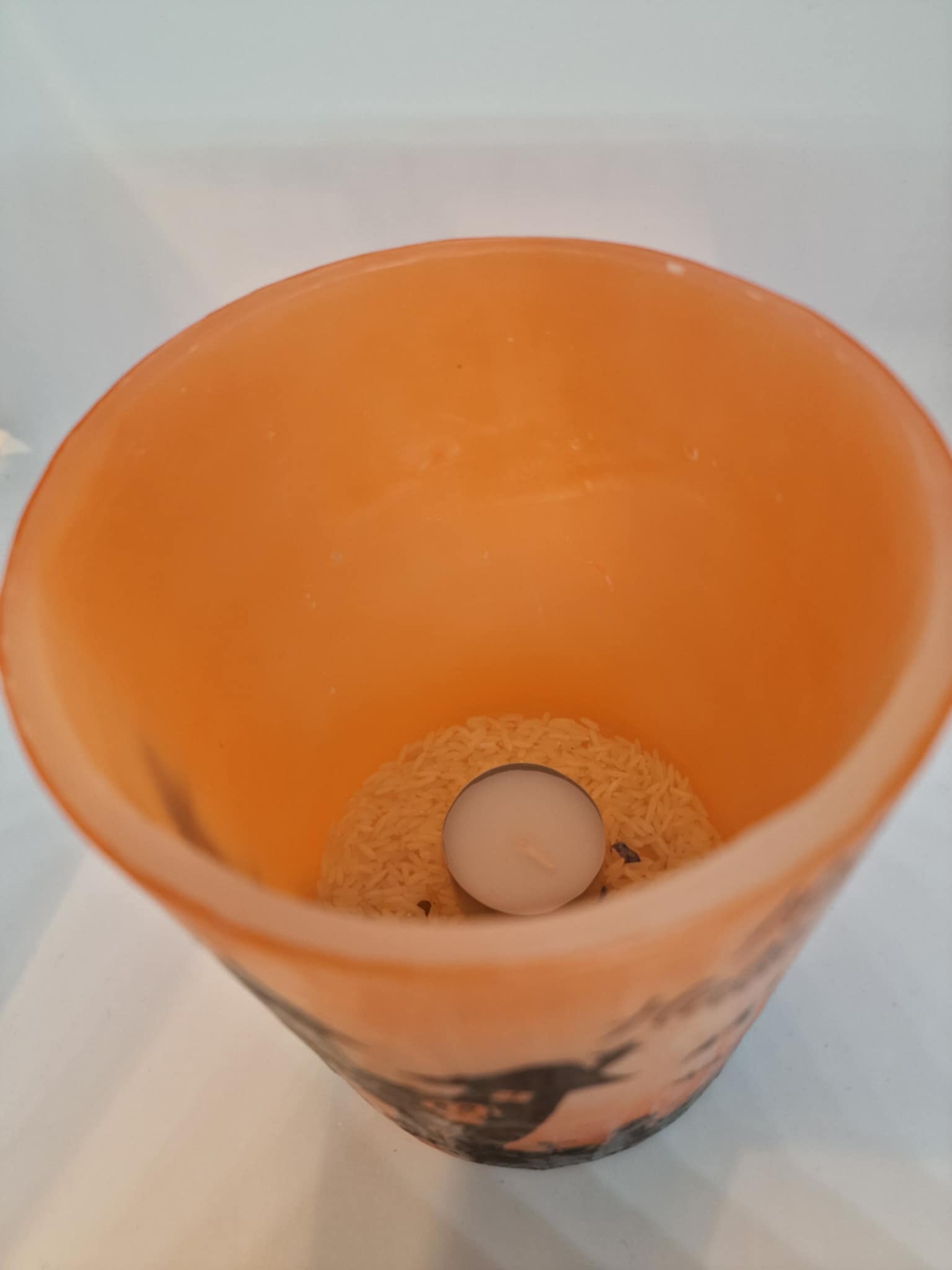 Giet de rijst, die je in het zakje vindt, in de kaarslantaarn, zodat deze de onderkant van de lantaarn bedekt. Plaats vervolgens het waxinelicthje op de rijst en zorg ervoor dat het waxinelichtje zich in het midden van de voet bevindt en niet te dicht bij de wanden van de kandelaar, zodat de wanden niet beschadigd raken door de hitte van de vlam.Je kunt in plaats van rijst, zand, kiezelstenen of linzen. Je kunt van alles gebruiken waarvan je denkt dat het geschikt is om de basis van het kaarslantaarn te beschermen tegen de hitte van de warmte.