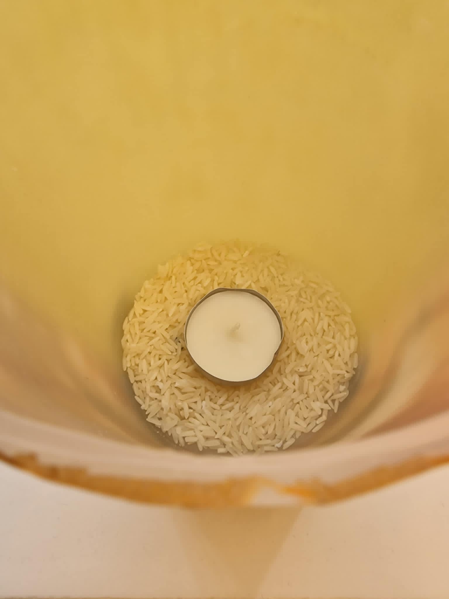 Giet de rijst, die je in het zakje vindt, in de kaarslantaarn, zodat deze de onderkant van de lantaarn bedekt. Plaats vervolgens het waxinelicthje op de rijst en zorg ervoor dat het waxinelichtje zich in het midden van de voet bevindt en niet te dicht bij de wanden van de kandelaar, zodat de wanden niet beschadigd raken door de hitte van de vlam.Je kunt in plaats van rijst, zand, kiezelstenen of linzen. Je kunt van alles gebruiken waarvan je denkt dat het geschikt is om de basis van het kaarslantaarn te beschermen tegen de hitte van de warmte.