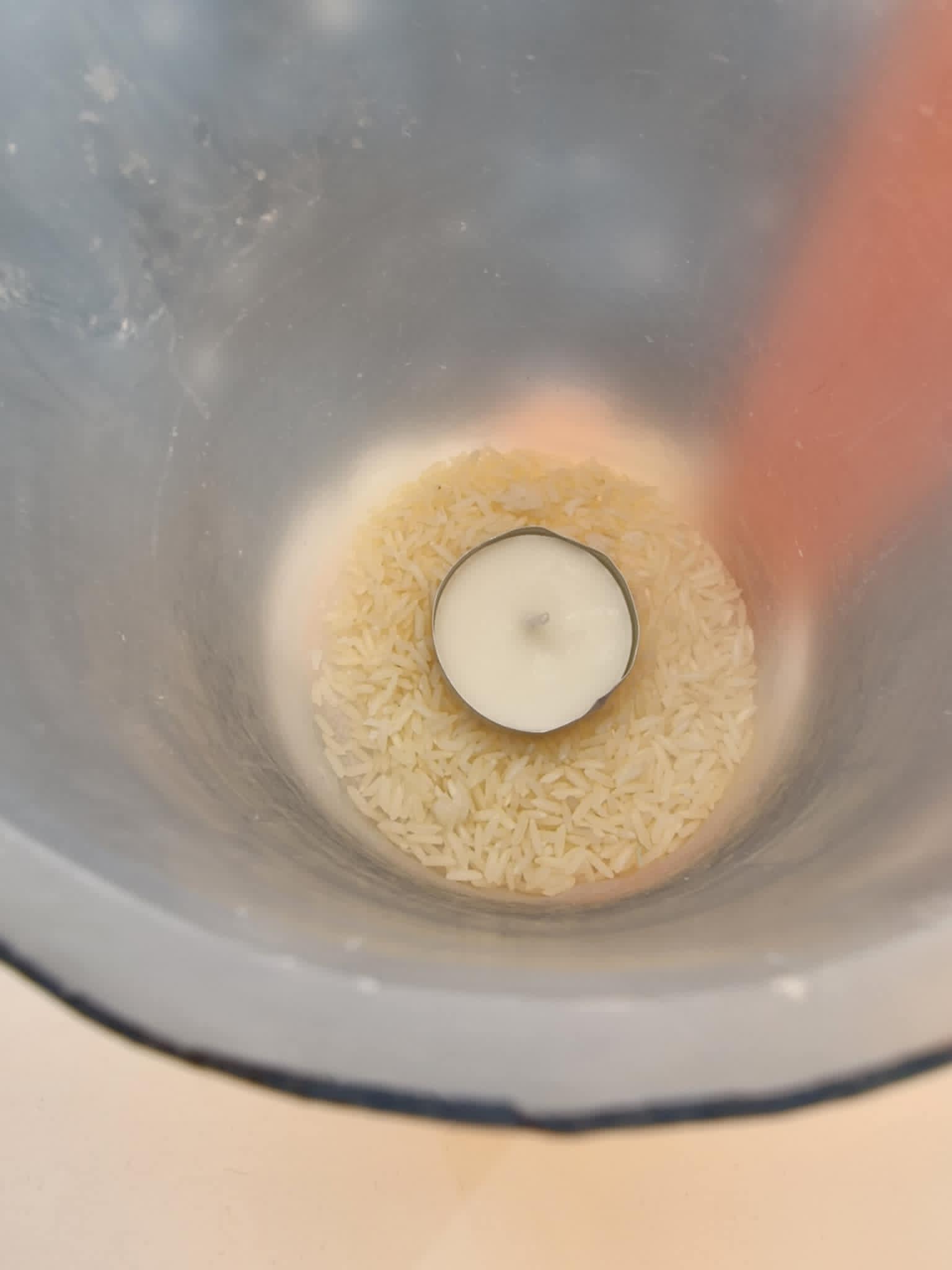 Giet de rijst, die je in het zakje vindt, in de kaarslantaarn, zodat deze de onderkant van de lantaarn bedekt. Plaats vervolgens het waxinelicthje op de rijst en zorg ervoor dat het waxinelichtje zich in het midden van de voet bevindt en niet te dicht bij de wanden van de kandelaar, zodat de wanden niet beschadigd raken door de hitte van de vlam.Je kunt in plaats van rijst, zand, kiezelstenen of linzen. Je kunt van alles gebruiken waarvan je denkt dat het geschikt is om de basis van het kaarslantaarn te beschermen tegen de hitte van de warmte.