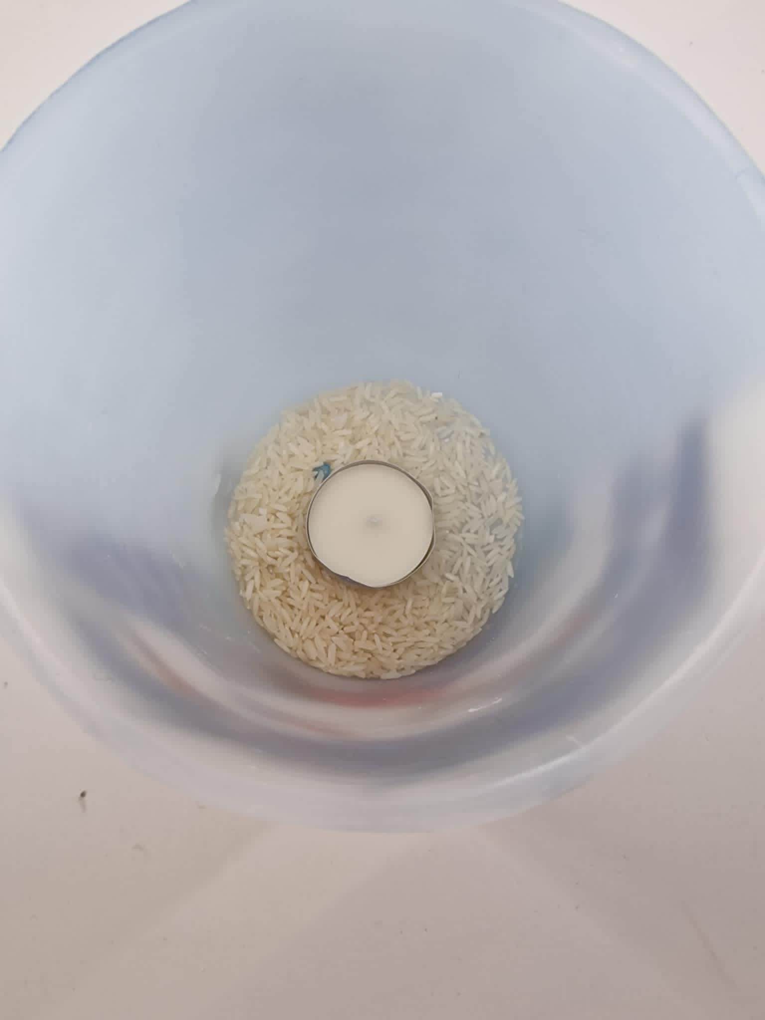 Giet de rijst, die je in het zakje vindt, in de kaarslantaarn, zodat deze de onderkant van de lantaarn bedekt. Plaats vervolgens het waxinelicthje op de rijst en zorg ervoor dat het waxinelichtje zich in het midden van de voet bevindt en niet te dicht bij de wanden van de kandelaar, zodat de wanden niet beschadigd raken door de hitte van de vlam.Je kunt in plaats van rijst, zand, kiezelstenen of linzen. Je kunt van alles gebruiken waarvan je denkt dat het geschikt is om de basis van het kaarslantaarn te beschermen tegen de hitte van de warmte.