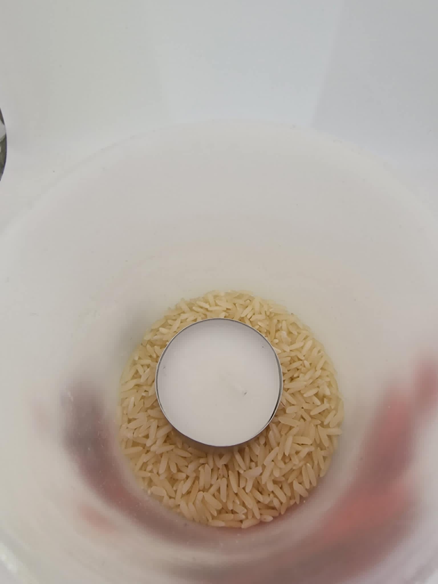 Giet de rijst, die je in het zakje vindt, in de kaarslantaarn, zodat deze de onderkant van de lantaarn bedekt. Plaats vervolgens het waxinelicthje op de rijst en zorg ervoor dat het waxinelichtje zich in het midden van de voet bevindt en niet te dicht bij de wanden van de kandelaar, zodat de wanden niet beschadigd raken door de hitte van de vlam.Je kunt in plaats van rijst, zand, kiezelstenen of linzen. Je kunt van alles gebruiken waarvan je denkt dat het geschikt is om de basis van het kaarslantaarn te beschermen tegen de hitte van de warmte.