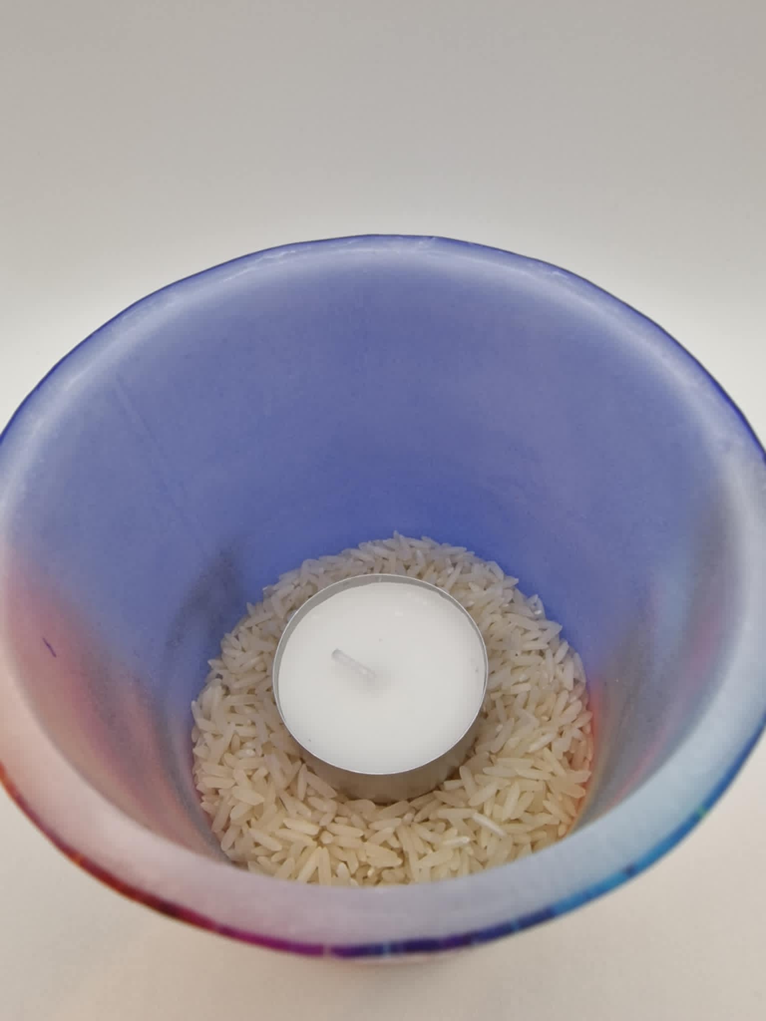 Giet de rijst, die je in het zakje vindt, in de kaarslantaarn, zodat deze de onderkant van de lantaarn bedekt. Plaats vervolgens het waxinelicthje op de rijst en zorg ervoor dat het waxinelichtje zich in het midden van de voet bevindt en niet te dicht bij de wanden van de kandelaar, zodat de wanden niet beschadigd raken door de hitte van de vlam.Je kunt in plaats van rijst, zand, kiezelstenen of linzen. Je kunt van alles gebruiken waarvan je denkt dat het geschikt is om de basis van het kaarslantaarn te beschermen tegen de hitte van de warmte.