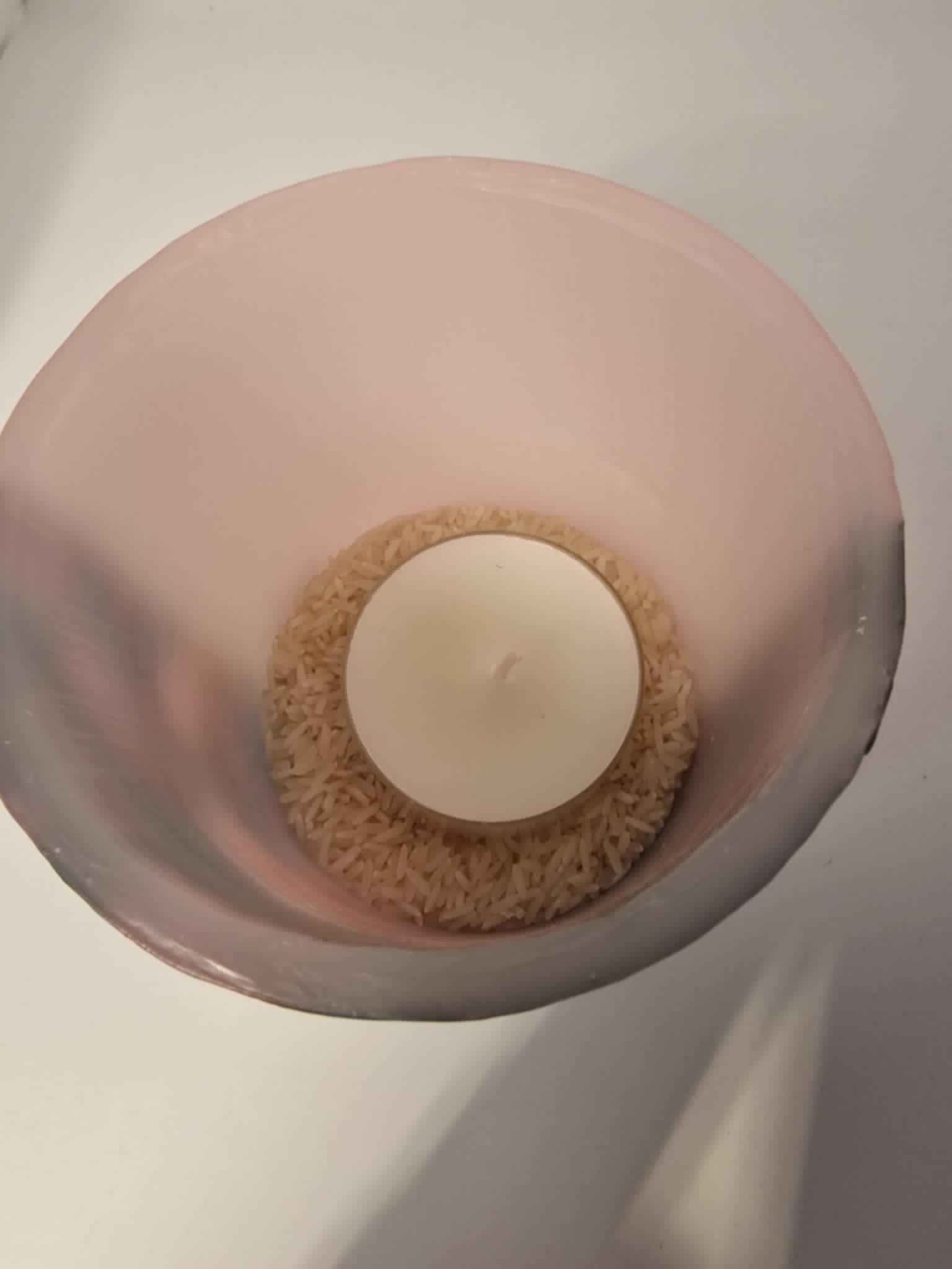 Giet de rijst, die je in het zakje vindt, in de kaarslantaarn, zodat deze de onderkant van de lantaarn bedekt. Plaats vervolgens het waxinelicthje op de rijst en zorg ervoor dat het waxinelichtje zich in het midden van de voet bevindt en niet te dicht bij de wanden van de kandelaar, zodat de wanden niet beschadigd raken door de hitte van de vlam.Je kunt in plaats van rijst, zand, kiezelstenen of linzen. Je kunt van alles gebruiken waarvan je denkt dat het geschikt is om de basis van het kaarslantaarn te beschermen tegen de hitte van de warmte.