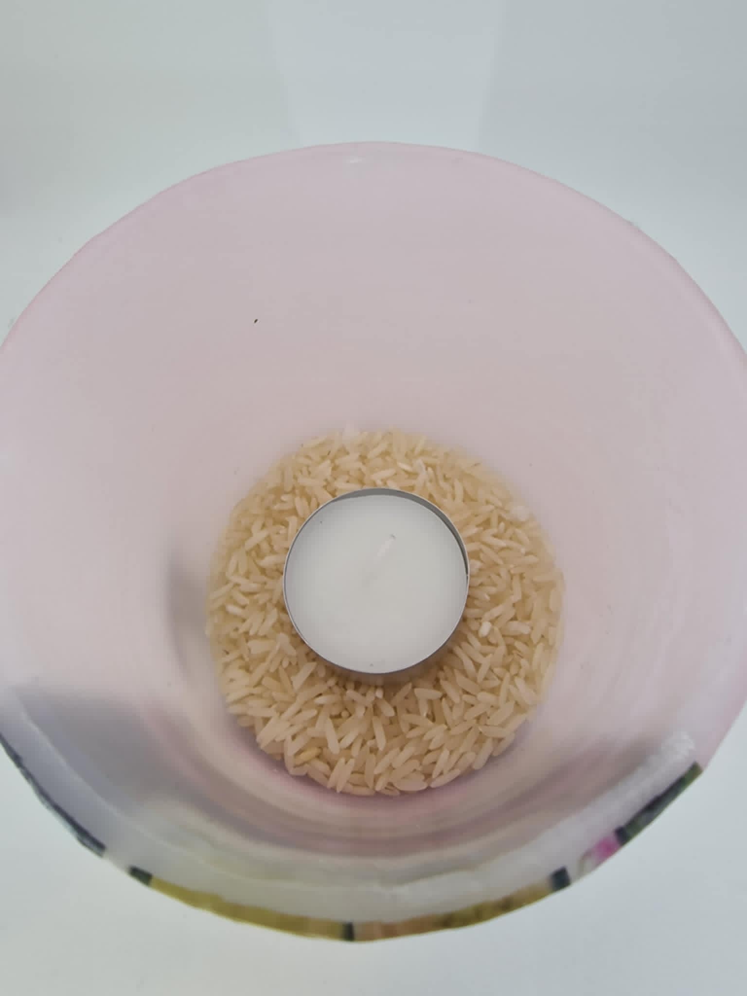 Giet de rijst, die je in het zakje vindt, in de kaarslantaarn, zodat deze de onderkant van de lantaarn bedekt. Plaats vervolgens het waxinelicthje op de rijst en zorg ervoor dat het waxinelichtje zich in het midden van de voet bevindt en niet te dicht bij de wanden van de kandelaar, zodat de wanden niet beschadigd raken door de hitte van de vlam.Je kunt in plaats van rijst, zand, kiezelstenen of linzen. Je kunt van alles gebruiken waarvan je denkt dat het geschikt is om de basis van het kaarslantaarn te beschermen tegen de hitte van de warmte.