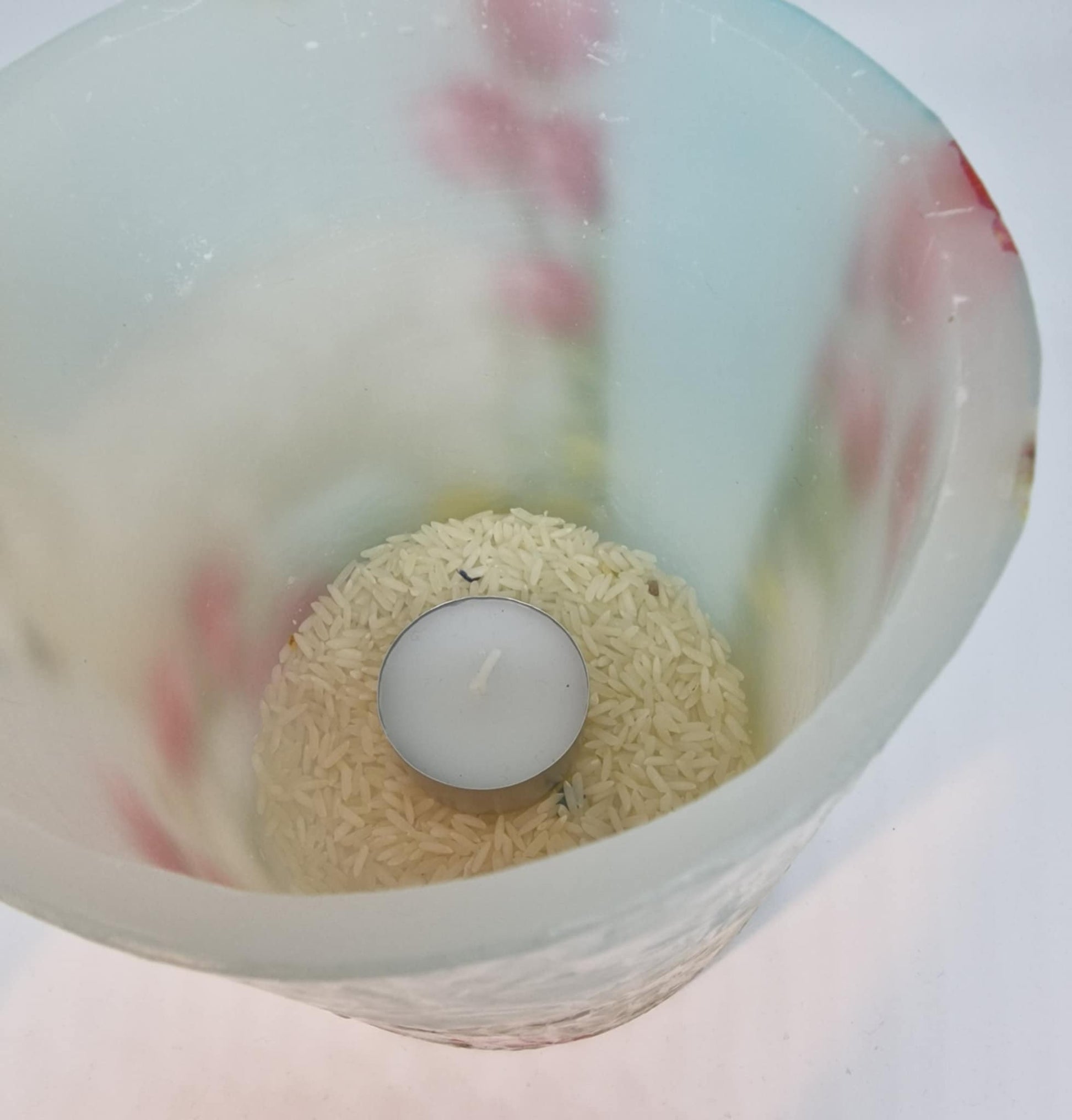 Giet de rijst, die je in het zakje vindt, in de kaarslantaarn, zodat deze de onderkant van de lantaarn bedekt. Plaats vervolgens het waxinelicthje op de rijst en zorg ervoor dat het waxinelichtje zich in het midden van de voet bevindt en niet te dicht bij de wanden van de kandelaar, zodat de wanden niet beschadigd raken door de hitte van de vlam.Je kunt in plaats van rijst, zand, kiezelstenen of linzen. Je kunt van alles gebruiken waarvan je denkt dat het geschikt is om de basis van het kaarslantaarn te beschermen tegen de hitte van de warmte.