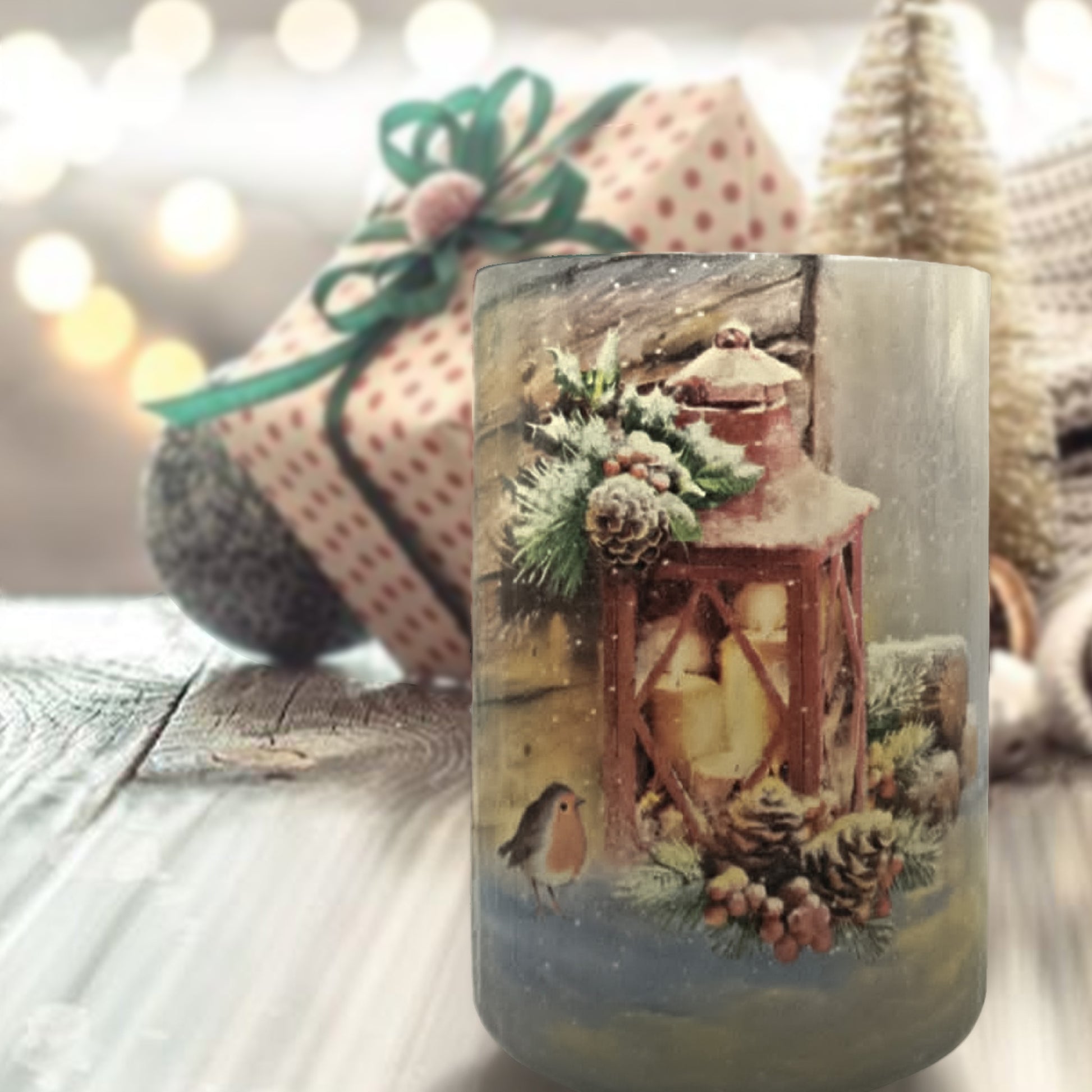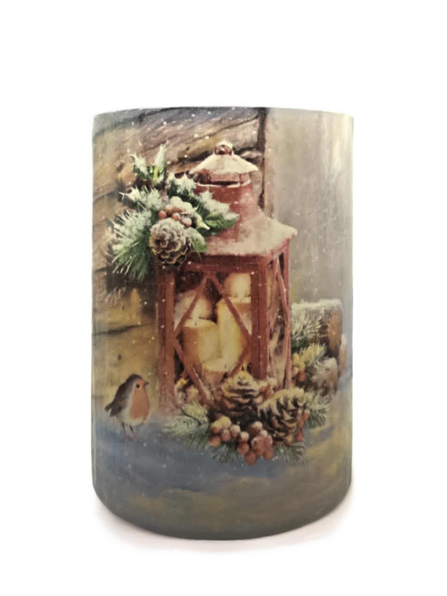 Versierde kerstlantaarn en vogeltje in de sneeuw