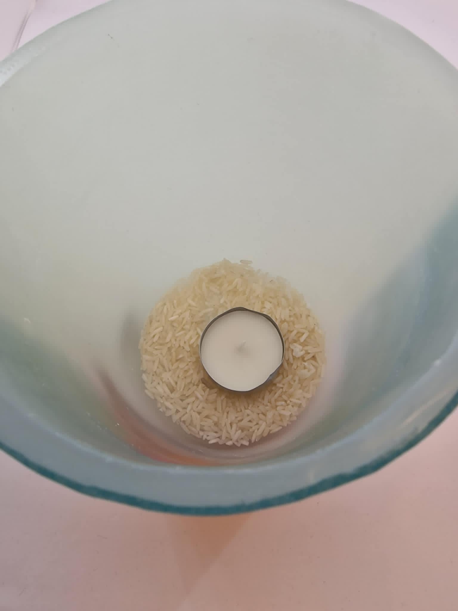 Giet de rijst, die je in het zakje vindt, in de kaarslantaarn, zodat deze de onderkant van de lantaarn bedekt. Plaats vervolgens het waxinelicthje op de rijst en zorg ervoor dat het waxinelichtje zich in het midden van de voet bevindt en niet te dicht bij de wanden van de kandelaar, zodat de wanden niet beschadigd raken door de hitte van de vlam.Je kunt in plaats van rijst, zand, kiezelstenen of linzen. Je kunt van alles gebruiken waarvan je denkt dat het geschikt is om de basis van het kaarslantaarn te beschermen tegen de hitte van de warmte.