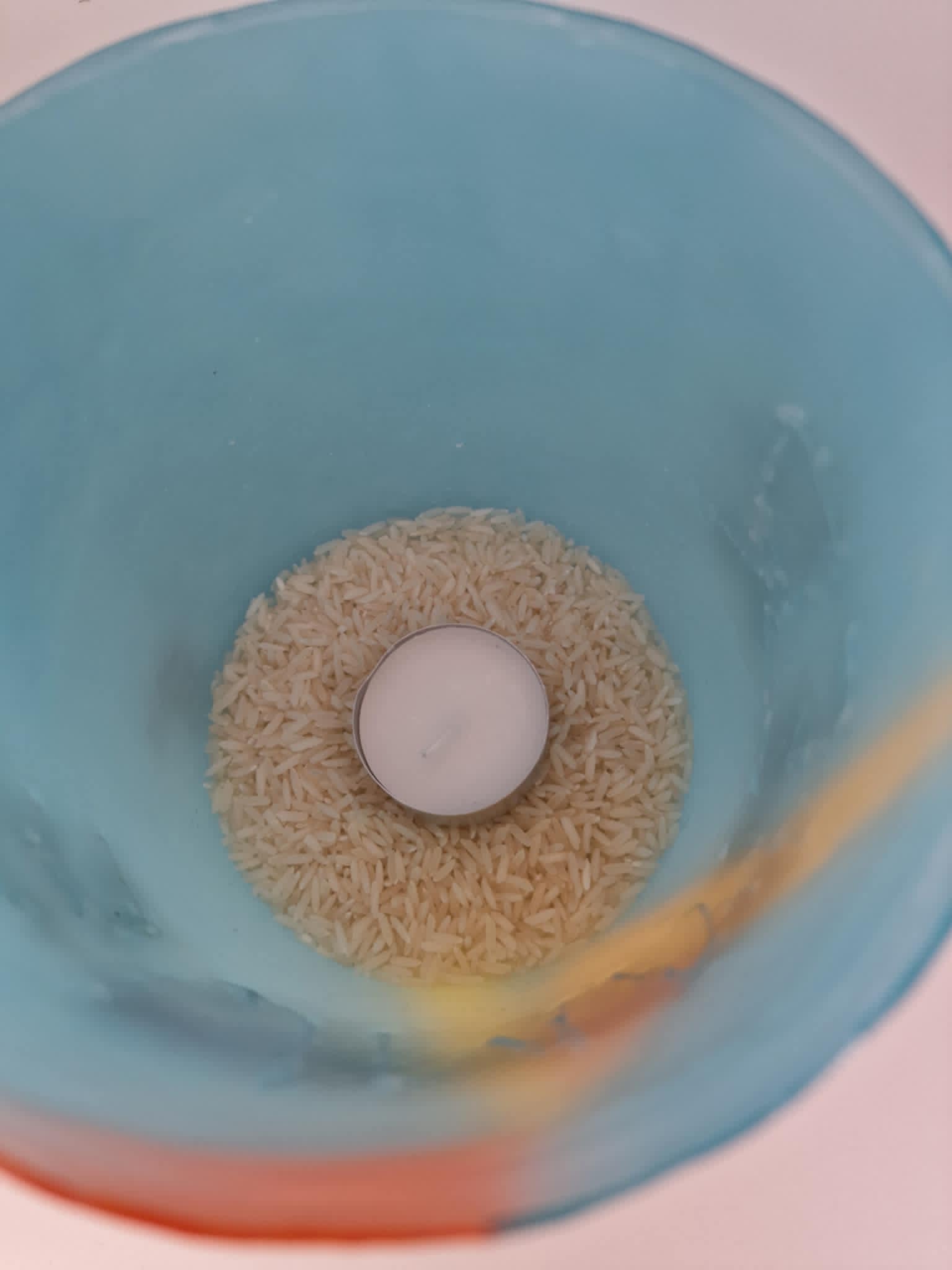 Je kunt in plaats van rijst, zand, kiezelstenen of linzen. Je kunt van alles gebruiken waarvan je denkt dat het geschikt is om de basis van het kaarslantaarn te beschermen tegen de hitte van de warmte.